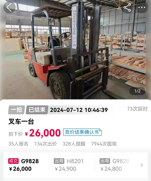 不久前,什邡法院在办理一起买卖合同纠纷执行案件过程中,依法查封被执行人的机器设备。后在网络司法拍卖被执行人叉车的过程中,倪某经多轮竞价最终以26000元的价格竞拍成功。