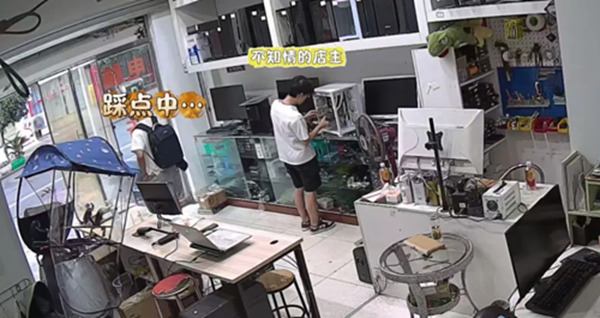监控显示,当晚凌晨4时许,在商铺内就传出了一声声异响。此时,因室内光线较暗,一名年轻男子正点着打火机鬼鬼祟祟地在四周翻找东西。作案期间,该男子抬头发现有监控时,便躲在物品柜后,一边试图遮挡自己的外貌,一边寻找监控电源线的位置,并伺机将其关闭。