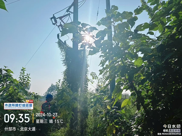 二、强化路灯维修。加大巡查力度,发现损坏路灯,立即组织工人进行维修。本月,共维修路灯50盏,更换路灯10盏,处理线路故障8处。对嘉陵江西路、北京大道等道路路灯专变搭火点周围杂木长势较高问题,高压线藤树缠绕导电存在安全隐患问题,对其周围树木、枯枝进行了清理,将隐患消灭在萌芽状态,保障路灯线路安全运行和周边环境的安全,目前已清理6处,做到发现一处处理一处,确保亮灯率98%以上。