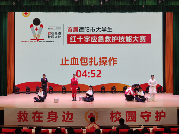 在德阳市首届大学生红十字应急救护技能大赛上午的复赛中,来自全市11所高校的参赛队伍齐聚一堂,展示他们在应急救护方面的专业技能和青春风采,经分组理论考试、心肺复苏+AED使用、止血包扎、骨折固定等项目比拼,共有6支队伍脱颖而出,进入下午的决赛。