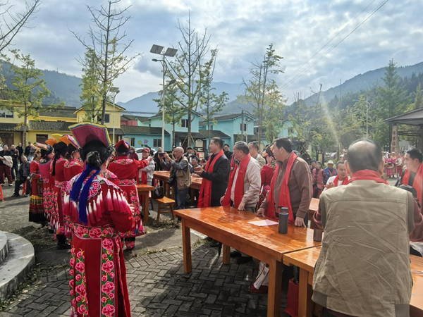 活动当天,现场男女老少身着精美民族服装载歌载舞,欢庆节日。清平镇九顶山山歌队的表演是一大亮点,他们把民俗节庆礼仪和歌舞巧妙融合,为宾客献上羌红并共唱《献红歌》。