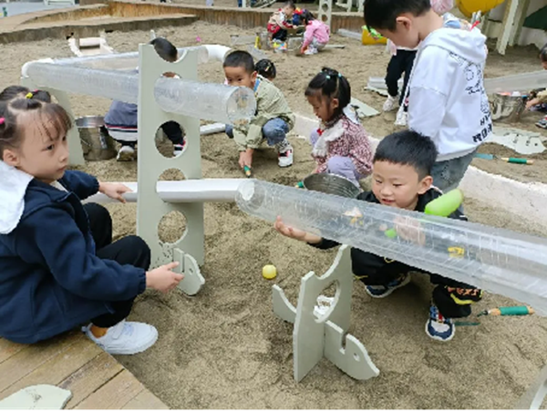 游戏中,幼儿不断尝试拼搭的组合方式,探究兴趣十分浓厚,亲身感知沙子流动与管道摆放的顺序、高低、方向之间的逻辑关系。