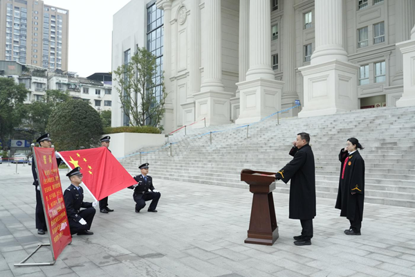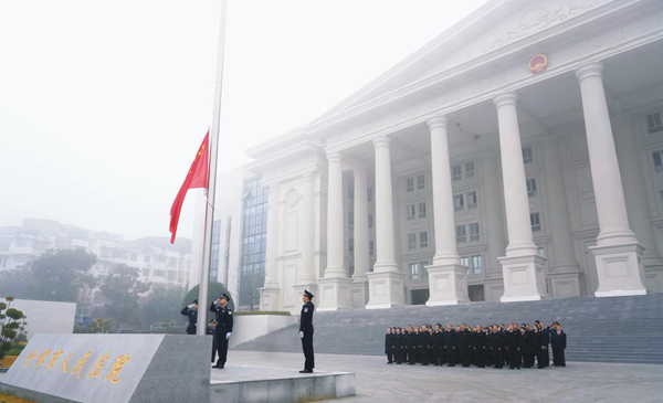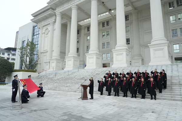 清晨,什邡法院全体干警于法治广场集合,当国歌奏响时,干警们神情庄重,肃穆而立,昂首凝望鲜红的五星红旗缓缓升起、迎风飘扬。