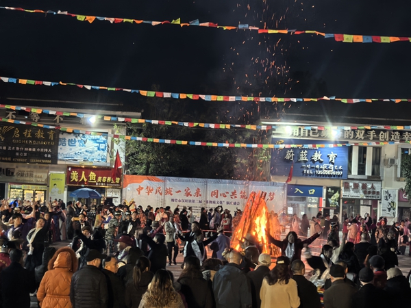 活动期间,来自云南、成都、凉山、绵阳、阿坝、德阳等地的21支少数民族锅庄队伍齐聚一堂,展示民族特色服装、礼仪和不同风格的锅庄舞蹈。在篝火晚会上,锅庄队伍身着民族盛装,伴随音乐,跳起欢快的锅庄舞。锅庄舞的热情与活力感染周边近千名群众参与其中,大家手拉着手、肩并着肩,脸上洋溢着幸福的笑容,在一曲曲欢快的锅庄舞中,展现出各民族团结、繁荣的时代新貌。