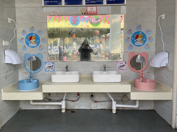 “哇,那个粉色的洗手池好可爱啊!”在游乐园里,一位小女孩牵着妈妈的手,一眼就看到了刚改造完成的公厕,兴奋地说道。