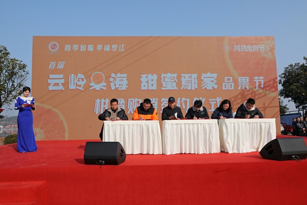 活动现场还举行签约仪式,本地种植大户与购货商代表武汉邓氏果品有限公司、海口秀英区张祥品果商贸经营部、烟台焕友商贸有限公司等签订一百万余斤柑橘购销协议。