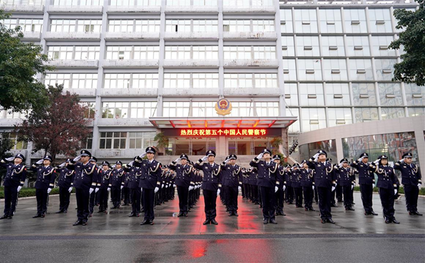 上午9时,升警旗仪式正式开始。仪仗队员精神抖擞,护卫着中国人民警察警旗,迈着铿锵有力的步伐行进到升旗台。伴随着嘹亮的《中国人民警察警歌》,警旗徐徐升起,全场同志向警旗庄严敬礼。