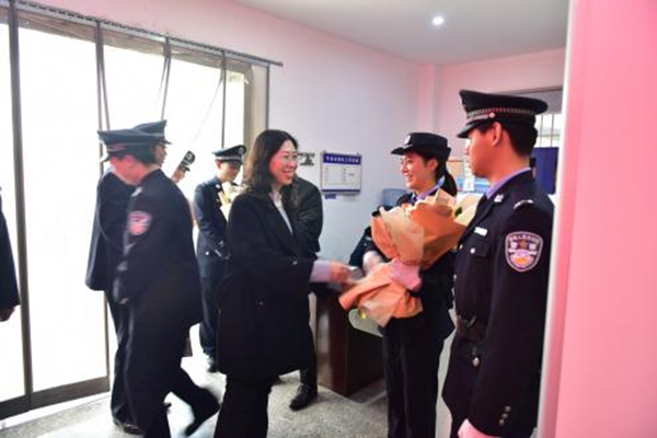 警察节当天,党组书记、院长李家带领在院班子成员深入一线,到安检、诉服中心对在岗干警进行节日慰问,给执勤干警送上鲜花及慰问品。随后,与法警队干警开展座谈,肯定了法警队干警的工作,并提出希望。