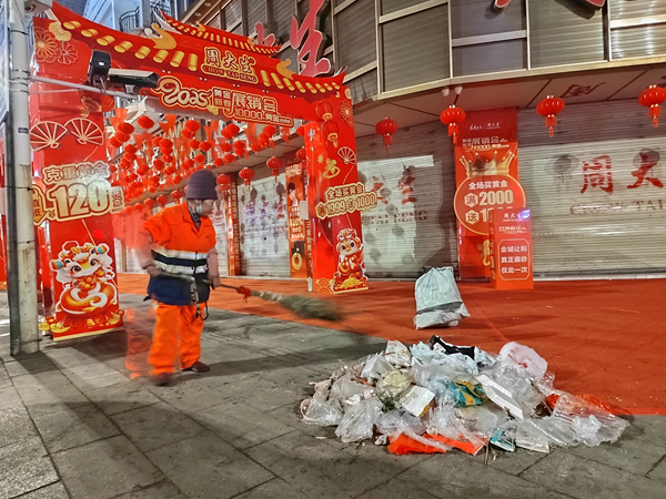 春节期间,城市的热闹程度直线上升,走亲访友、聚会庆祝等活动不断,随之而来的是垃圾量的大幅增加。然而,不管天气多么寒冷,每天天还没亮,环卫工人就已开始忙碌。他们穿梭在街头巷尾,认真清扫着每一处角落。成堆的鞭炮纸屑、散落的各类垃圾,都被他们一一清理干净。从清晨到夜晚,他们用自己的辛勤劳作,维护着城市的整洁面貌。