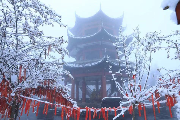冬季的钟鼎寺银装素裹,积雪深厚,整个寺庙和山林被白雪覆盖,宛如一幅绝美的水墨画。春节期间,大量游客前往钟鼎寺赏雪、玩雪,什邡法院蓥华法庭积极响应全省人民法院系统开展的“冬游四川,司法同行”系列活动,前往钟鼎寺向游客们开展普法宣传,传递司法温暖。